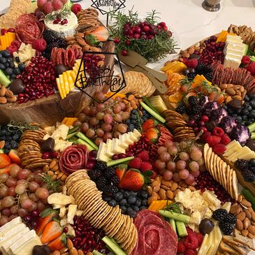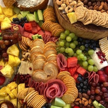 Our Special Occasion Table spread Includes 5 cheeses, 3 cured meats, fresh grapes, assorted fruits and berries, assorted nuts, Belgian Chocolate bites, 3 sorts or crackers!