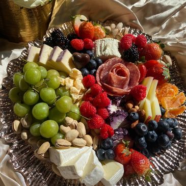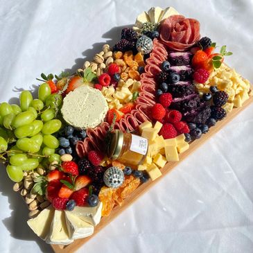 Our Medium Charcuterie platters includes 3 cheeses, assorted nuts, assorted berries, 2 cured meats, 2 sorts of crackers, and fresh grapes!