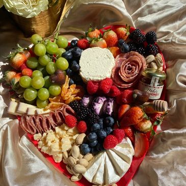The Perfect Charcuterie board for a date with your loved ones! This Special Heart Charcuterie comes with 3 Cheeses, 2 Meats, Berries, Nuts, Grapes, Sweet Dried Mandarins, and Heats Shaped Belgian Chocolates. -$70